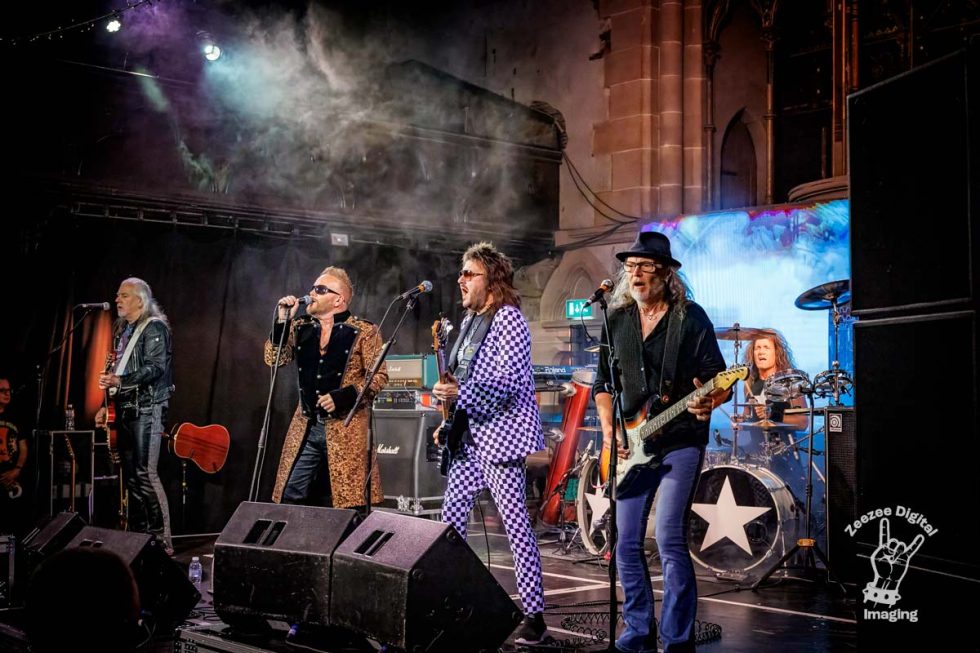 Jupiter Calling – The synth tones are rolling through the intro as the visual screen lets the track come to life as the crowd starts clapping and letting the groove build. The rhythm section comes at us kicking in the doors with a real meaty snare drum beat that lets the bass kicks take the groove onwards as the cymbal snaps let the track breathe, the soaring, melodic vocals are just incredible as they wrap themselves around this toe tapping monster that just grows on you. Willie is looking resplendant in his black and white checked suit that just seems befitting for tonight’s performance as the bassline drops in with sultry, delicious tones that really give this track depth, swagger and bags of emotion as the mid section slows for a bit as the cool synth tones ripple through the track and they let the groove tell it’s own story as Dean steps forward and unleashes a soaring solo that is just awesome as the fist pumping groove leads us into –