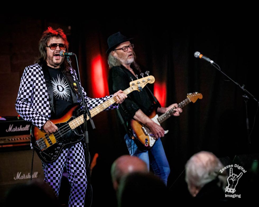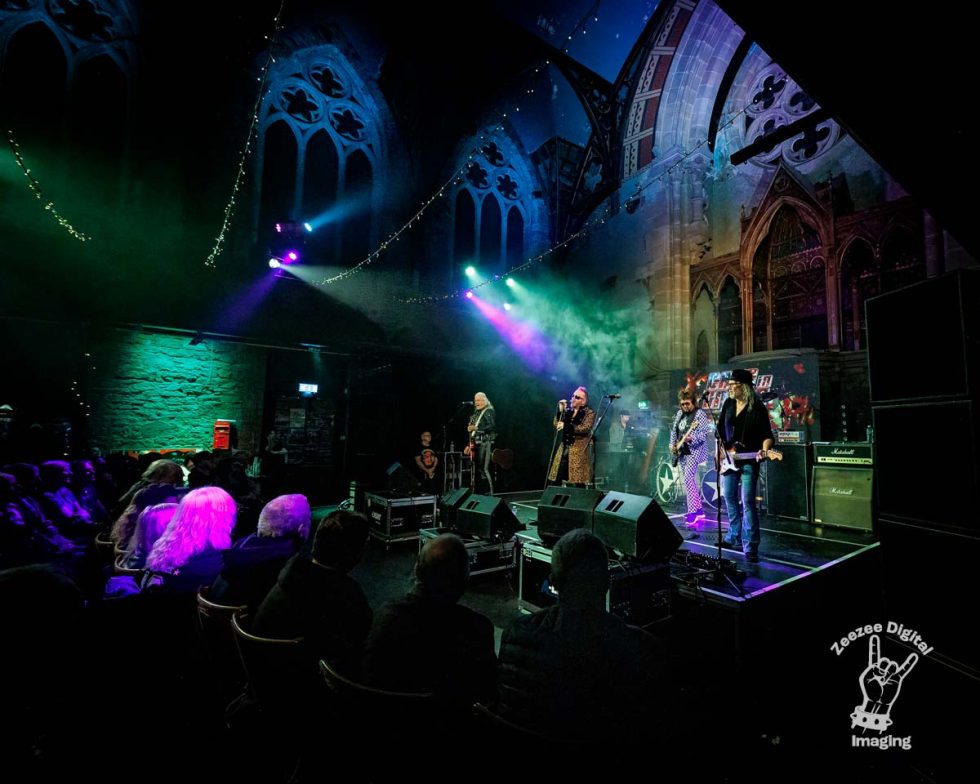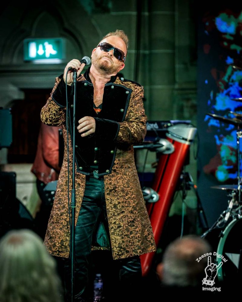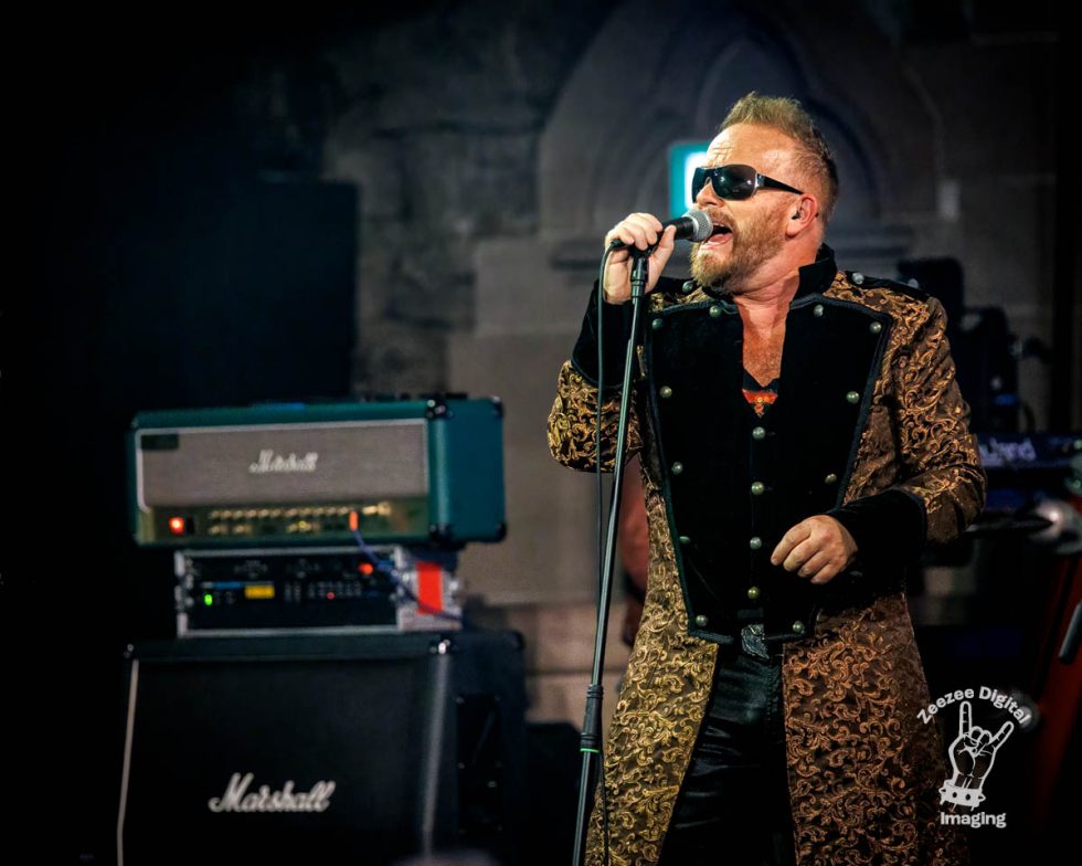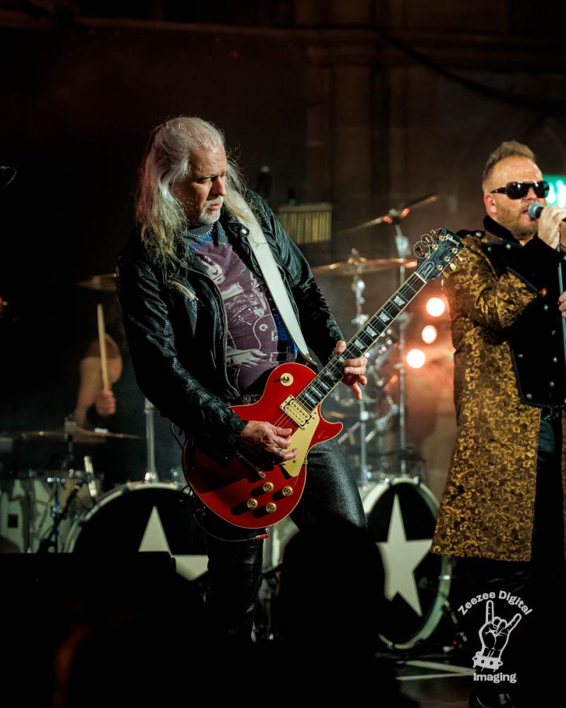 Too Many Gods – The track kicks off with a cool synth intro as the shredding guitars come at us as Damien steps forward in his spectacular gold & black full lenght coat and trademark dark glasses as this funky, toe tapping monster catches our attention as the boys bring us their colossal arrangement that fits perfectly into this intimate setting, the band are tight, precise and firing on all cylinders as this opening track gives us a taste of what’s in store tonight. The groove is a real fast and furious tone that gives the place a shake as the cool synth tones flow effortlessly through the venue, a slick. punchy solo oozes from Greg as he really pushes the track onwards as we really feel this is gonna be a real special night. The crowd are up on their feet cheering and hollering as the boys just shift through the gears and take us onto –