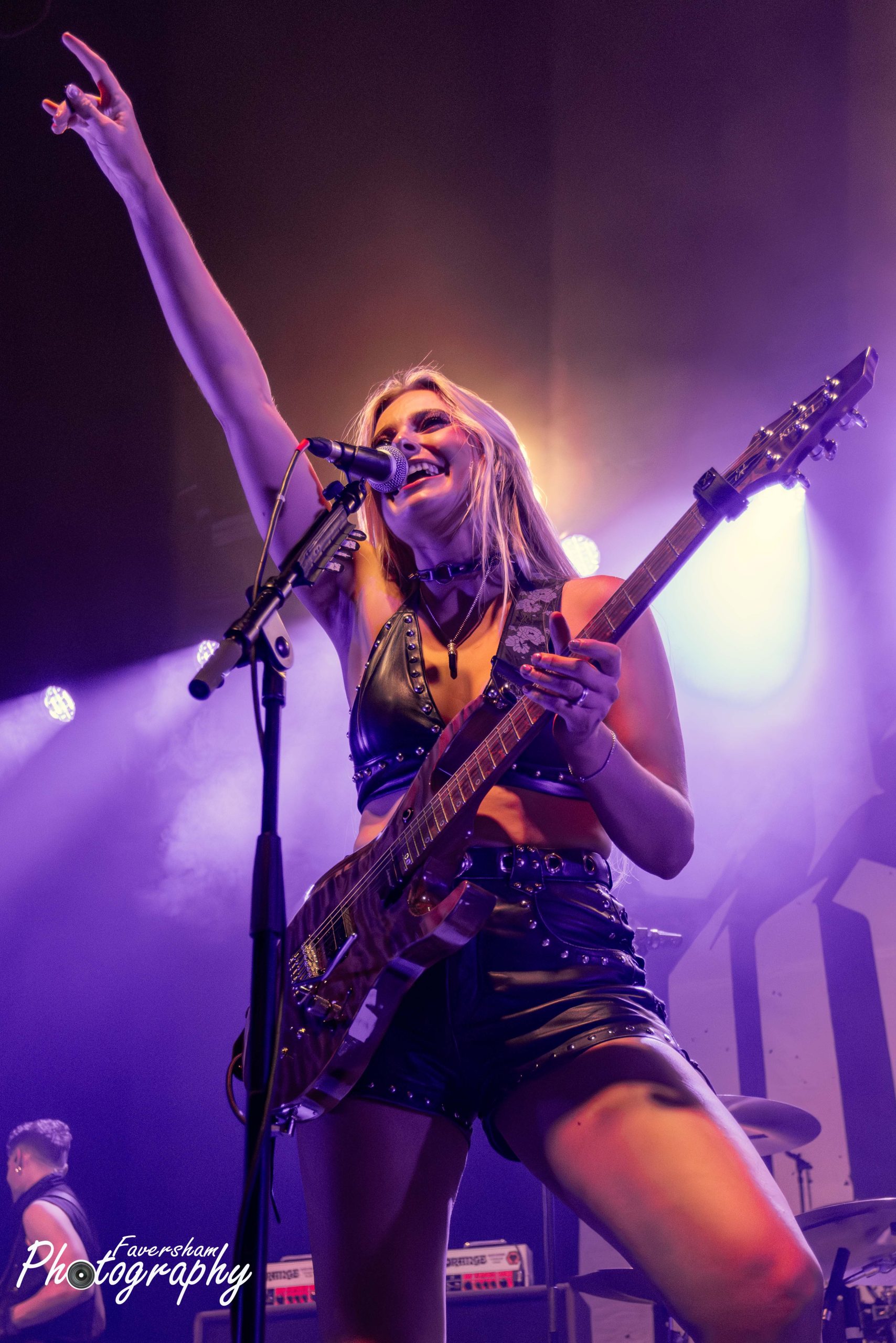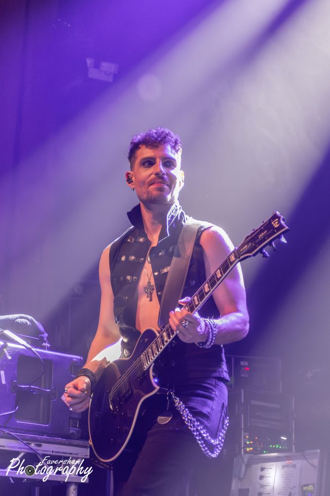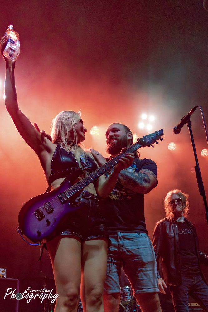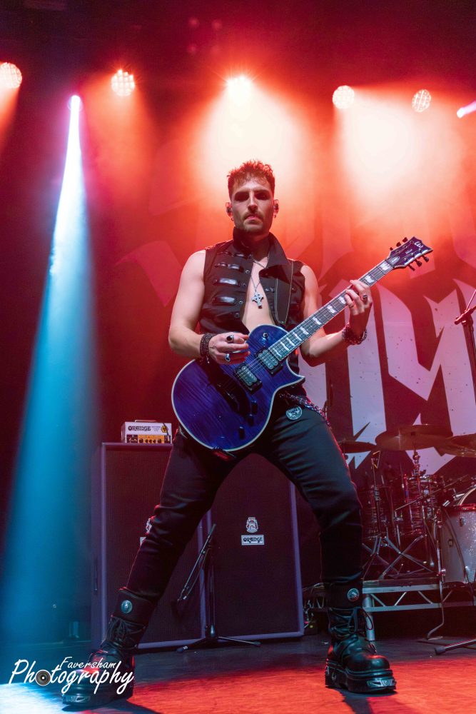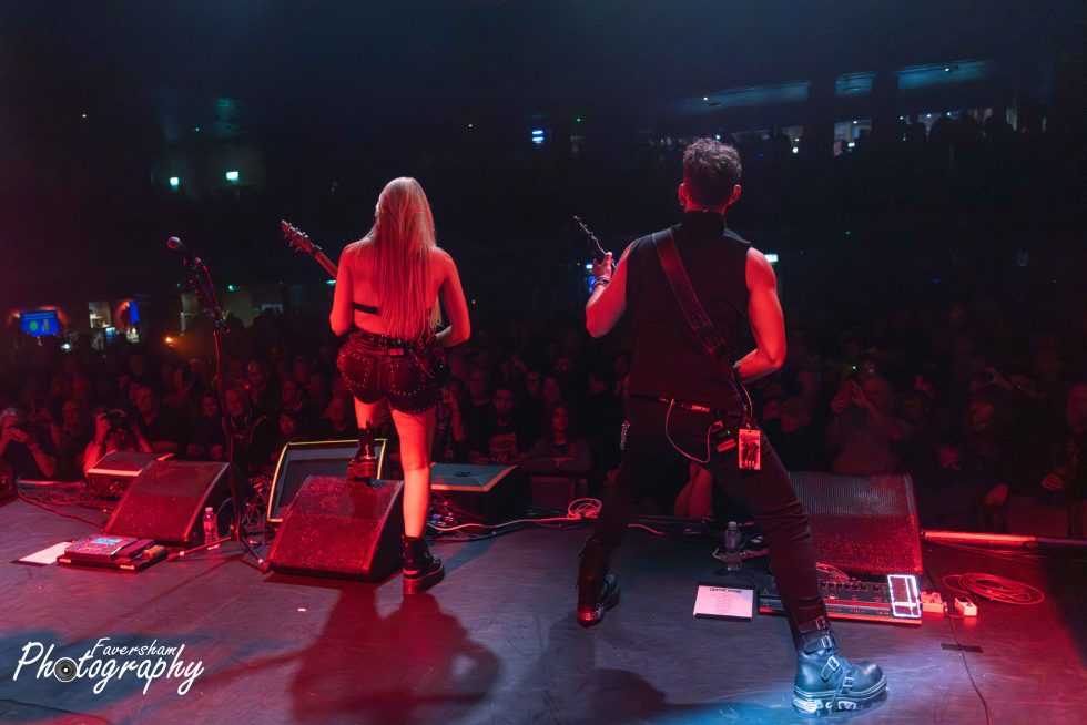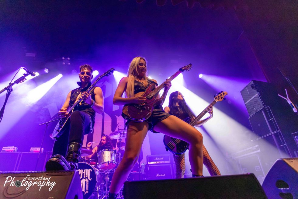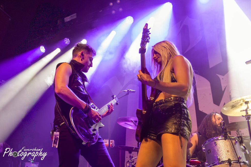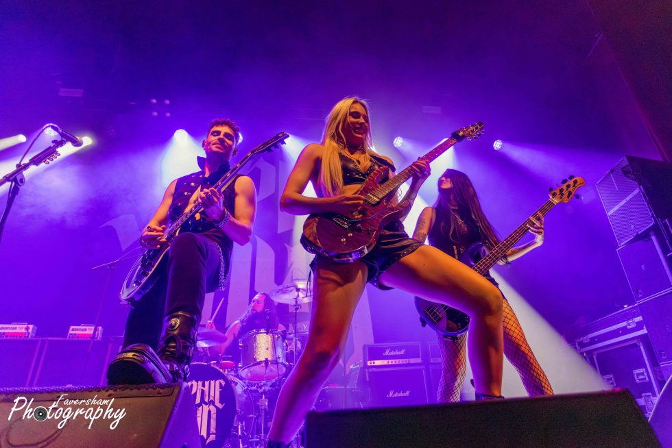 In her now trademark entrance, the gongs from Top Gun start over the PA Sophie enters the stage playing the melody for the track before being joined by the rest of her band for a shortened rendition of Battleground. Having been present at many a Sophie Lloyd show dating back to her inaugural performance at the Underworld just over a year ago, it is clear how the band’s chemistry has developed in that time with the group interacting from the start. At the conclusion of the song Sophie addresses the crowd “Hello Manchester, how are you all doing tonight” being met with cheers. “Are you guys ready to rock out with us?” She then proceeds to play You Give Love a Bad Name, having previously covered Bon Jovi before the World Cup Final and had tens of thousands singing back at her as well as being commented on by Jon Bon Jovi himself. From his side of the stage Christian Rivers is animated and moving around in a way I had not previously seen from him. The crowd sing along with track as Sophie shreds through, one foot on the monitor at the front of the stage. Iman Ahmed leads the crowd in clapping along to which they duly oblige and Sophie thanks the audience before welcoming Marisa Rodrigez of Marisa and the Moths to the stage for Hanging On. Iman and Sophie are face to face playing as Marisa delivers a stunning rendition of the album track originally voiced by Lauren Babic. In a now common sight to see Marisa and Sophie go back-to-back, the pair oozing chemistry as Christian and Iman jump around the stage. Marisa calls to the crowd mid song “Manchester let’s hear you, come on” and Manchester lets the band know they are there. Marisa then shows her vocal ability delivering a scream reminiscent of Alissa Gluz-White to start next track Won’t You Come. During the solo section Marisa dances on the floor as Sophie stands over her playing again showing the fantastic relationship between the two. The interaction has provided many a photo opportunity for photographers over the past 12 months. Finishing again with the Arch Enemy style vocals Marisa calls “Scream for me Manchester” in a Bruce Dickinsonesque manner. In another nod to Iron Maiden Sophie and Iman point their instruments forward and move in unison.