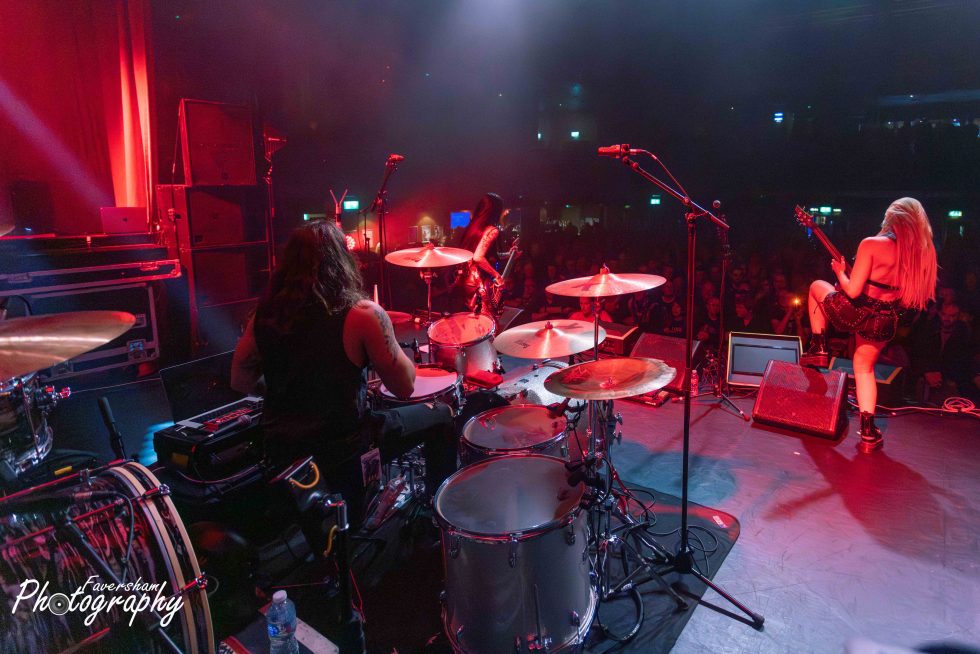 Following a cheer Marisa says, “Give it up for Chris Painter on the drums whose birthday it is today”. Chris raises his hand in acknowledgement as Sophie leads the claps. “Repeat after me” commands Marisa as she sings “She’s a runaway” and the crowd reciprocate, and Chris spins his drum stick before delivering the first beats on the cymbals. Iman and Sophie start jumping and Christian interacts with Chris at the kit before the song moves into it’s slower section. Marisa then leaves the stage as Sophie starts the distinctive intro to AC/DC’s Thunderstruck. Chris holds his hand to his ear encouraging the crowd to join in as they did for You Give Love a Bad Name. Again, the band jump along to the track with Christian showing how much he is enjoying the show. After a quick guitar change Sophie introduces the first song she ever wrote, Delusions, which is met with a massive cheer. Sophie thanks the crowd then introduces herself and jokes that they don’t want to hear her sing. Marisa rejoins the band on stage for album title track Imposter Syndrome. Chris shows his stickmanship twirling a drumstick and Marisa and Sophie again go back-to-back at the front of the stage bathed in red light. Speaking to the audience Marisa asks “Are you still with us Manchester” before commenting “I think you maybe our favourite crowd so far”. The whole band starts clapping starting the participation from those gathered before Let it Hurt (the track normally featuring Chris Robertson of Blackstone Cherry). Sophie and Iman again interact both flinging their long hair and Iman pulling some moves in the style of Maiden’s Steve Harris. Christian takes to one knee at the front of the stage and interacts with those at the barrier. Marisa leaves, the band swap guitars and Sophie launches into her solo before transitioning into Metallica’s Enter Sandman. The crowd can be heard joining in, singing as they had done for all the famous covers in the set. Sophie calls for those gathered to join her in sermon for the breakdown of the Metallica classic. It a variation from the normal set the group take time to sing happy birthday to Chris and Sophie explains this is the only time they will hear her sing. Marisa then rejoins for the last song of the night Do Or Die. Sophie puts her let foot up on the bass drum and leans back while soloing presenting fantastic phot opportunities for those at the front of the barrier. The crowd start clapping along with the band as they approach the climax of the show before ultimately bringing it to an energetic close.