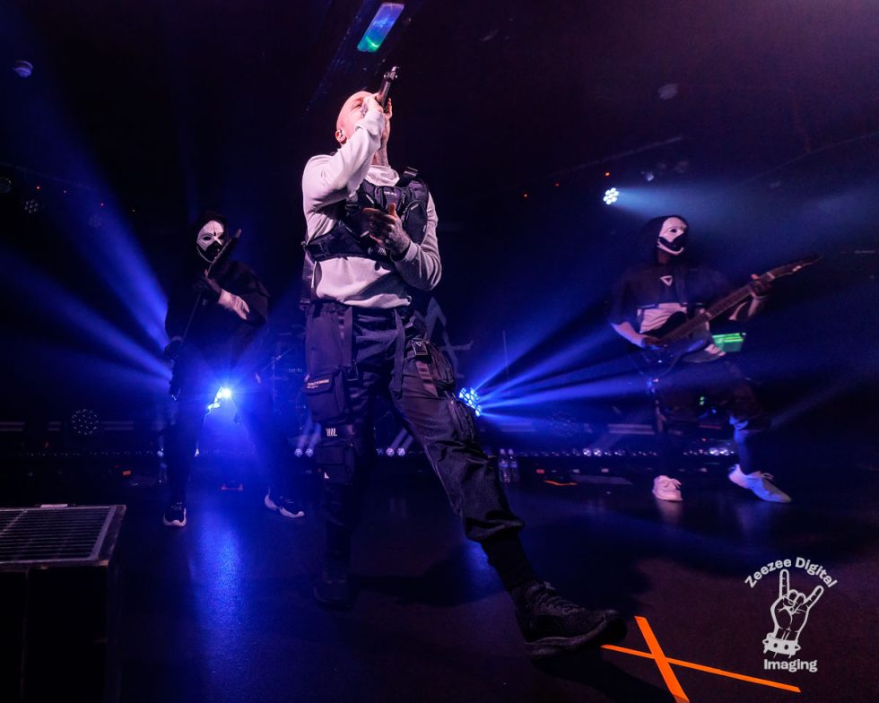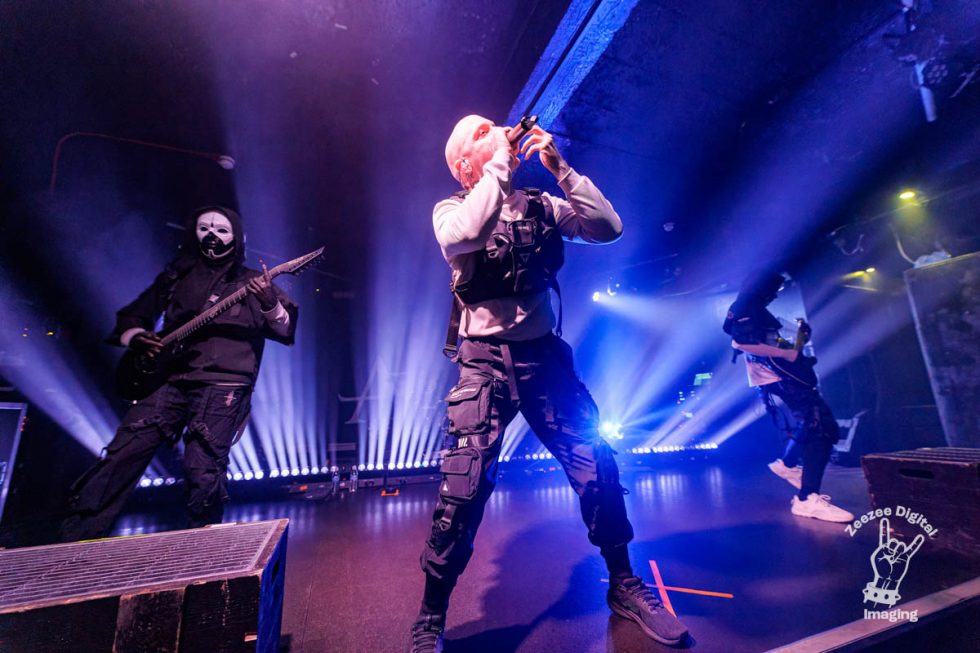 When the members of Aviana — Death, Fear, and Dark — take the stage, their all-black attire and haunting masks give them an almost ritualistic presence. Then comes Joel, bounding into view with the confidence of a frontman who knows he’s about to destroy every inch of this stage. The opening track, Delirium, explodes through the speakers like a warning shot — a tight, thunderous statement of intent that instantly whips the pit into motion.