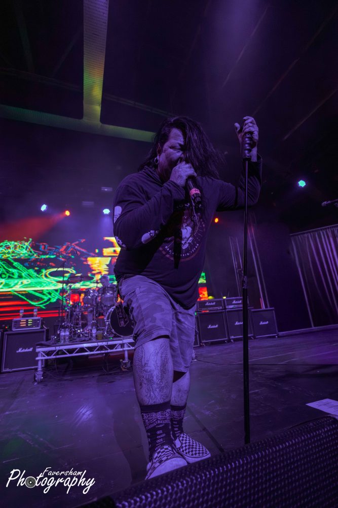 First to the stage were Californian band Hed PE the band formed in the 90s are known for their eclectic blend of music fusing punk, rap and reggae. The band were keen to get the evening off to an electric with vocalist Jared Gomes and bassist Kurt Blankenship swing their arms in a circular motion indicating they wanted the crowd to mosh. This was further emphasised when the band stopped mid track and Gomes addressed the crowd “Anybody want a pit. I know we are the opening band but don’t treat us like the opening band” to which the audience obliged.