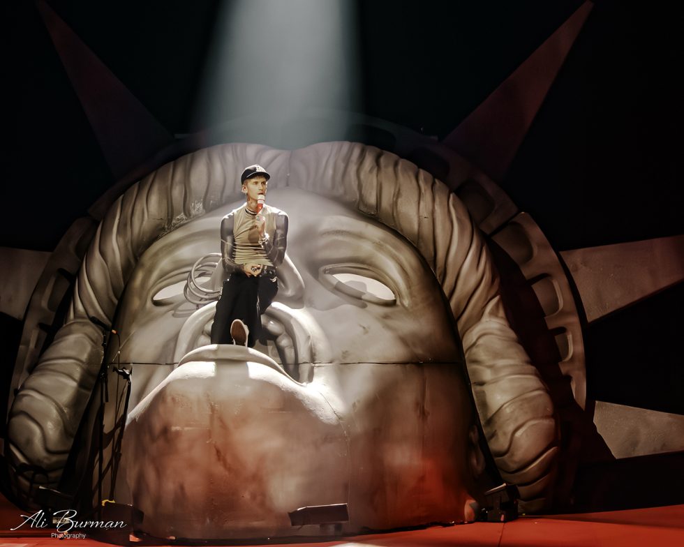 The scale of the production was apparent before a single note had been played. When the curtain dropped, a giant mock-up of the Statue of Liberty dominated the stage — an unexpected centrepiece, with the torch towering over the crowd as anticipation built inside the packed arena. The audience erupted as MGK emerged into the mouth of the statue, standing in a cloud of white smoke in a theatrical entrance that immediately set the tone for the night. At the same time his guitar descended from above the stage, lowering dramatically into his hands as the band launched into the opening track Outlaw Overture. It was a bold visual statement – exactly the kind of over-the-top moment arena rock thrives on.