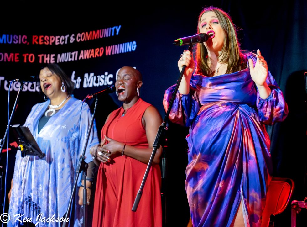 Spotting Alex Voysey nearby only added to the sense that we were in for a special night. In the end, a heavily pregnant Chloe was joined by an impressive ensemble: Jonathan Fashole-Luke (JFL) on keys; Marlene Hill and Gloria Miller on backing vocals; Chloe’s husband Jon Parkins and Chris Wood on guitars; and Julian Caesar on drums. As the musicians mounted the stage, Richard Dunning took his place on stage, comfortably seated in the onstage armchair, to introduce the band and explain the ethos of the club to those on their first visit.