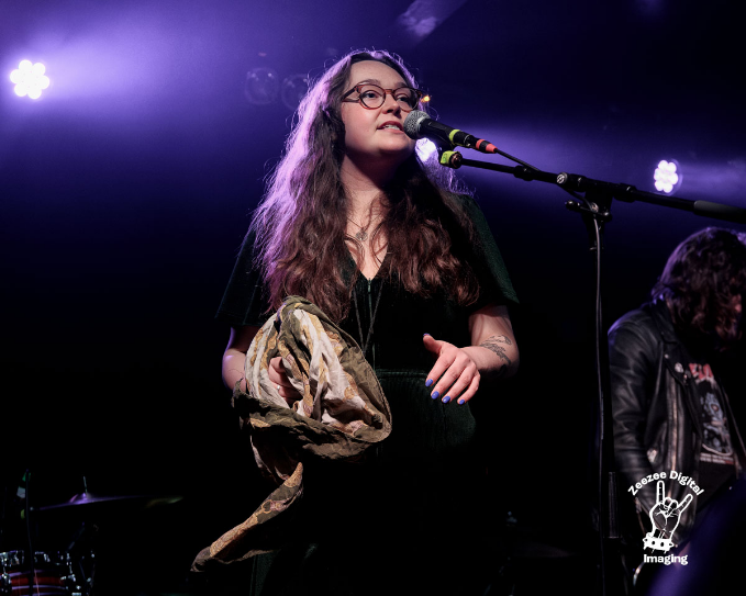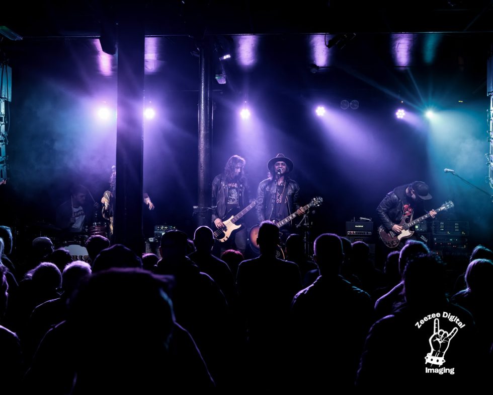 Kerosene Clown – The track kicks off with a real gritty, raspy guitar riff as Arjun leans in with his cool, gravel-soaked vocals as this bruiser comes to life as the place welcomes this cool outfit from Manchester. The added backing vocals from Luci add depth and a little swagger to this opening salvo as the band quickly settles into its stride; the twin guitar assault is just kicking ass as the band brings the sleazy groove to Glasgow tonight as we enjoy this opening number. The rhythm section is commanding the room with its punchy snare/bass kicks that let the cymbal taps complete the beat; a crunching, dirty solo comes at us as Arjun lets us feel the energy pouring from the stage tonight as we settle in and get ready for the upcoming onslaught from this killer outfit as we roll into –
