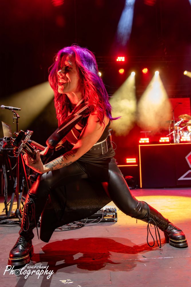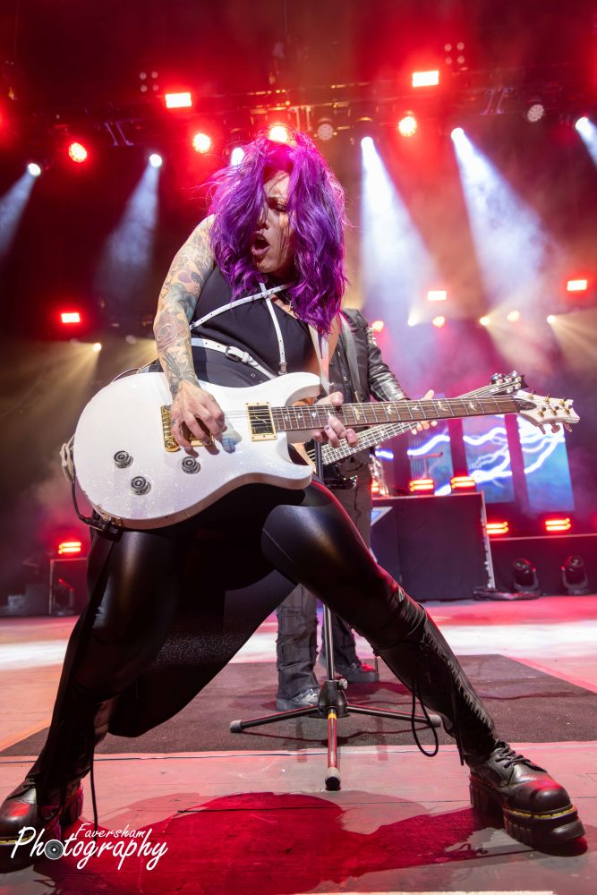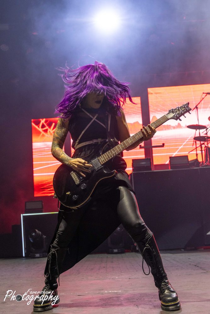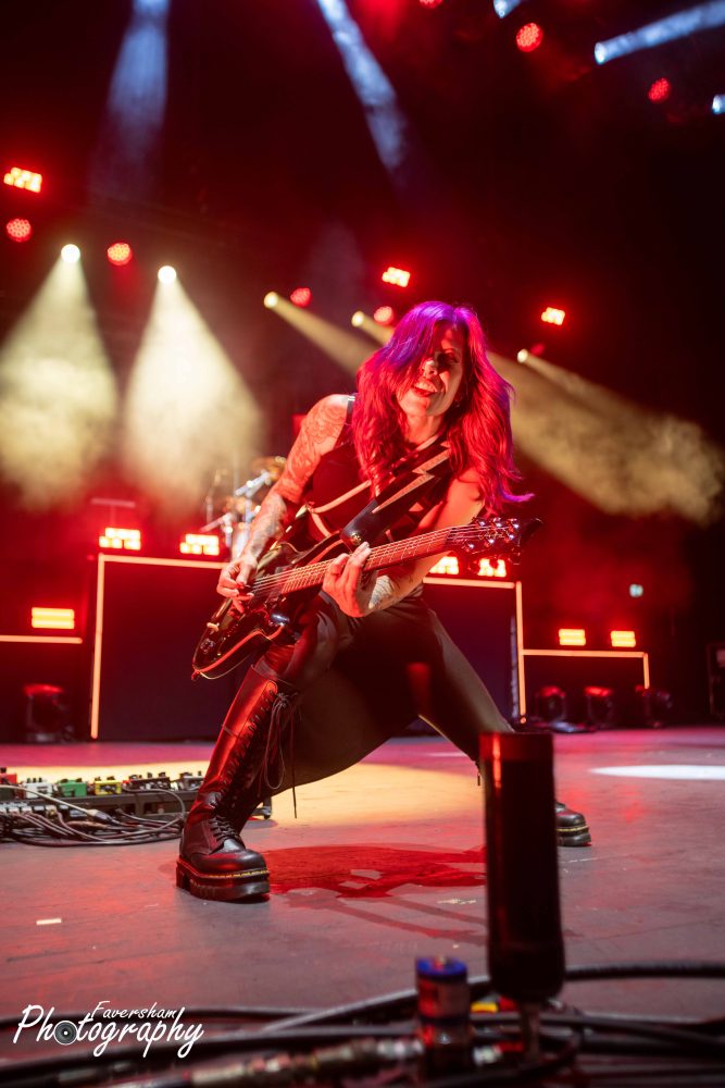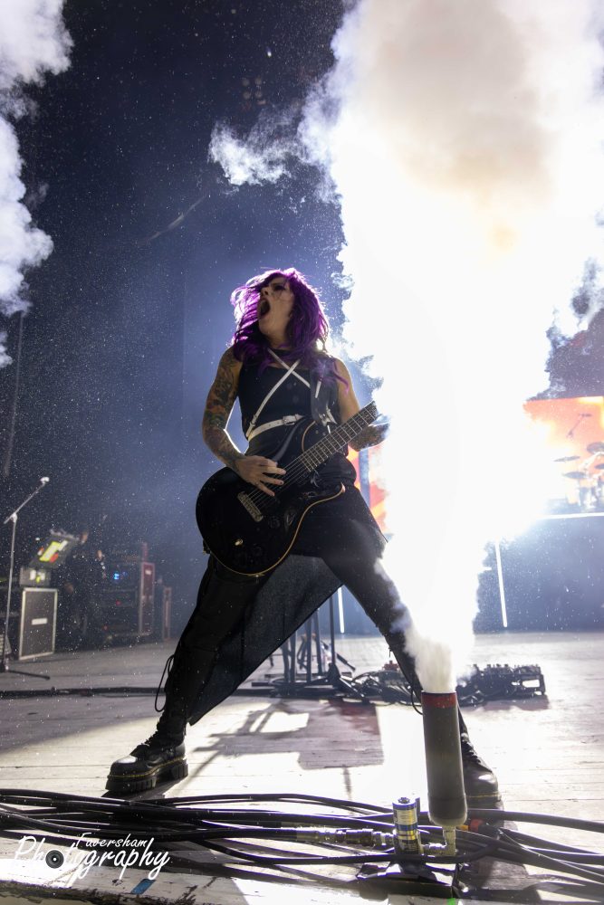 As we stood poised in the pit area at the in front of the barrier ready for Skillet to take to the stage, it was clear we were in for a treat. At the front vertical canons had been set up and at the rear of the stage was a huge drum riser as high as I’d ever seen at a gig. Jen Ledger was going to be able to see the whole audience clearly from her lofty vantage point. The room was packed, and they were all anticipating an electric show, they weren’t disappointed. From the very first song Surviving the Game those in attendance were treated to quite the show. The CO2 canons on the front of the stage roared framing John, Korey and Seth in their relative positions at the front of the stage and making the photographers at the front jump in the process. A personal highlight me came in the second song Feel Invincible as John saw me singing along while photographing and pointed straight at me and then posed pointing his bass towards me. As a photographer it is such a great feeling when the artists interact with you, and I have been lucky enough to have several of these moments at Brixton over the years. The vertical CO2 jets were not the only jets to be used as John strapped canons to both arms and proceeded to spray the area with the gas, covering all of us in range. Not to be out done Korey and Seth each mounted one side of Jen’s drummer riser to reveal moving hydraulic podia on either side of the drummer. There was absolutely no doubt that Skillet had come to entertain. The set had everything from the high energy music, stage production or the more emotional and touching sections. John recounted a heartfelt story about his mum’s death and how his best friend helped him through it, “Sometimes music was all I had. No matter who you are, what you’re going through, where you come from, the colour of your skin—we want to see you survive another day, I want to see you survive, keep fighting.” Jen then descended from her lofty position to sing with John at the front of the stage with drum duties being passed to a member of the crew.