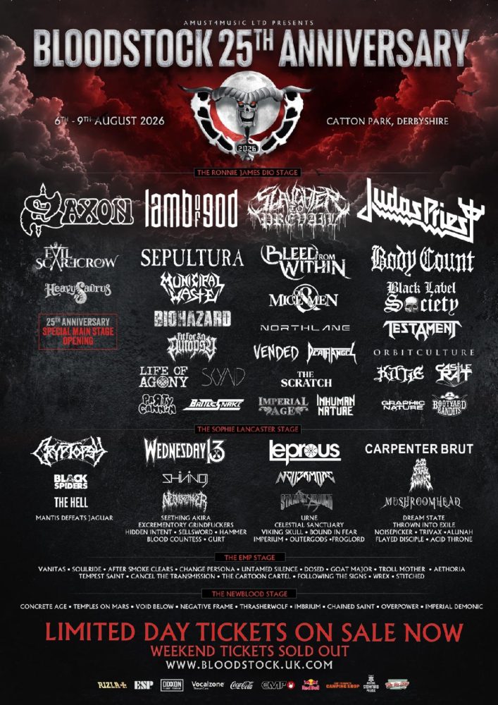 BLOODSTOCK’s 25th anniversary is going to be truly unforgettable. BLOODSTOCK 2026 is delighted to present RJD headliners LAMB OF GOD, SLAUGHTER TO PREVAIL, JUDAS PRIEST, and SAXON. Sophie Lancaster stage headliners will be CRYPTOPSY (None So Vile 30-year anniversary set), WEDNESDAY 13, LEPROUS, and CARPENTER BRUT. You’ll also be able to see BODY COUNT, SEPULTURA, MUNICIPAL WASTE, DEATH ANGEL, TESTAMENT, NORTHLANE, BLEED FROM WITHIN, VENDED, ORBIT CULTURE, THE SCRATCH, IMPERIAL AGE, LIFE OF AGONY, OF MICE & MEN, BIOHAZARD, 200 STAB WOUNDS, THE HELL, BLACK SPIDERS, SHINING, NEVERMORE, EVIL SCARECROW, HEAVYSAURUS, SKYND, PARTY CANNON, BATTLESNAKE, INHUMAN NATURE, KITTIE, CASTLE RAT, GRAPHIC NATURE, BOOTYARD BANDITS, EXCREMENTORY GRINDFUCKERS, HIDDEN INTENT, SELLSWORD, NECKBREAKKER, SEETHING AKIRA, HAMMER, STAMPIN GROUND, URNE, CELESTIAL SANCTUARY, THROWN INTO EXILE, VIKING SKULL, BOUND IN FEAR, IMPERIUM, FROGLORD, MUSHROOMHEAD, DREAM STATE, TRIVAX, MANTIS DEFEATS JAGUAR, BLOOD COUNTESS, GURT, OUTERGODS, FLAYED DISCIPLE, NOISEPICKER, ACID THRONEALUNAH, VOID BELOW, TEMPLES ON MARS, NEGATIVE FRAME, CONCRETE AGE, THRASHERWOLF, IMPERIAL DEMONIC, CHAINED SAINT, IMBRIUM, OVERPOWER, UNTAMED SILENCE, CHANGE PERSONA, AFTER SMOKE CLEARS, SOULRIDE, VANITAS, GOAT MAJOR, CANCEL THE TRANSMISSION, TEMPEST SAINT, TROLLMOTHER, DOSED, STITCHED, WREX, FOLLOWING THE SIGNS, THE CARTOON CARTEL, and AETHORIA. And there’s still more bands to be announced.